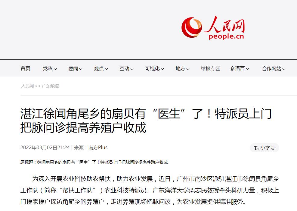 人民网刊发新闻《湛江徐闻角尾乡的扇贝有“医生”了!特派员上门把脉问诊提高养殖户收成》,对欧冠水产学院栗志民教授及其团队深入基层,为水产养殖户把脉问诊,为农业发展提供精准服务的事迹进行报道。