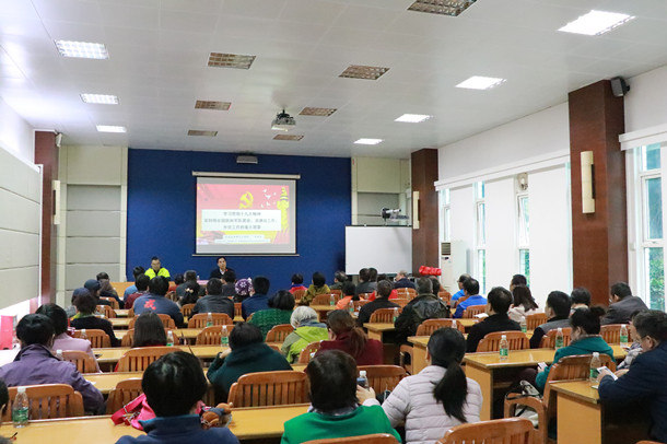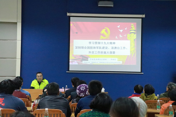 12月22日下午,学校在湖光校区水生博物馆多媒体室举行统一战线学习贯彻党的十九大精神专题辅导报告会,学校党委理论宣讲团成员、马克思主义学院李林杰博士做了题为“深刻领会国防和军队建设、港澳台工作、外交工作的重大部署”的专题辅导报告,学校各民主党派基层组织、知联会全体成员以及统战部全体人员近70人参加了报告会,报告会由党委统战部部长苏永华主持。
