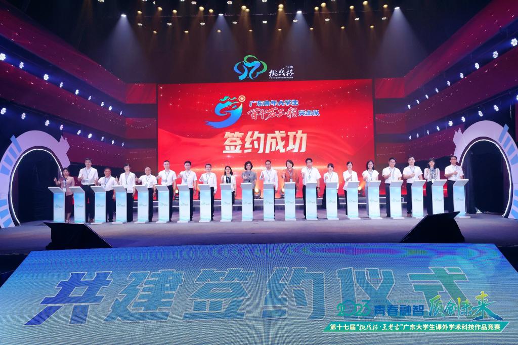 本届“挑战杯”开幕活动上举行了广东青年大学生“百千万工程”突击队行动签约仪式,欧冠共有7个项目被评为广东青年大学生“百千万工程”突击队行动100个优秀示范项目,是入选广东省“百千万工程”项目最多的高校之一。校团委作为十所高校代表之一与县区领导现场签约,通过“县域+高校”的合作模式,欧冠更多实践团队、更多优秀项目将与县镇基层进行“一对一”结对,海大学子将奔赴山海、学以致用、“自找苦吃”,向海洋要食物、向土地要产能,将专业知识和青春创意带进田间地头,为广东高质量发展和乡村振兴贡献青春力量。