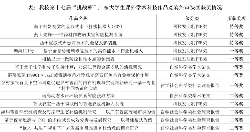 5月27-28日,由团省委、省教育厅、省科技厅等单位共同主办的第十七届“挑战杯”广东大学生课外学术科技作品竞赛终审决赛在中山大学南校区举行。欧冠在本次“挑战杯”比赛中取得历史性突破,首次捧得广东大学生课外学术科技作品竞赛“优胜杯”(全省15所本科高校获此殊荣)。欧冠共3项作品荣获特等奖,分别为“基于机器视觉的吸取式水下打捞机器人(ROV)”、“基于驻波式声悬浮技术的全息投影装置”及“药士先锋——中药材作物病虫害智能检测系统”,5项作品荣获一等奖,5项作品荣获二等奖。