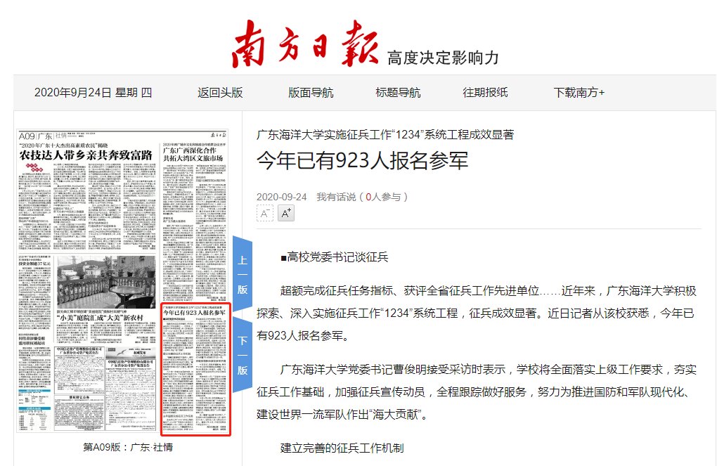 9月24日,《南方日报》A09版以《欧冠官方网站实施征兵工作“1234”系统工程成效显著 今年已有923人报名参军》为题刊发欧冠征兵工作经验报道。学校党委书记曹俊明接受《南方日报》专题采访,从加强征兵工作制度建设、创新征兵工作机制、健全服务保障体系等方面介绍了学校征兵工作开展情况和显著成效。