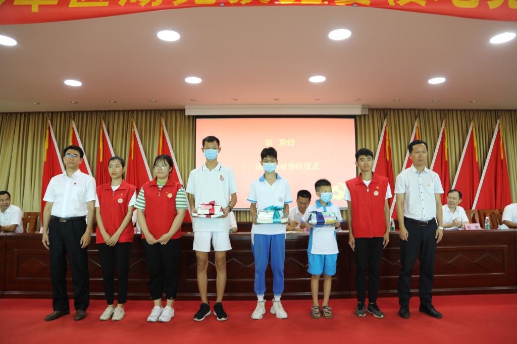 欧冠学生志愿者代表与湖光镇贫困户在校中小学生代表上台认领结对帮扶