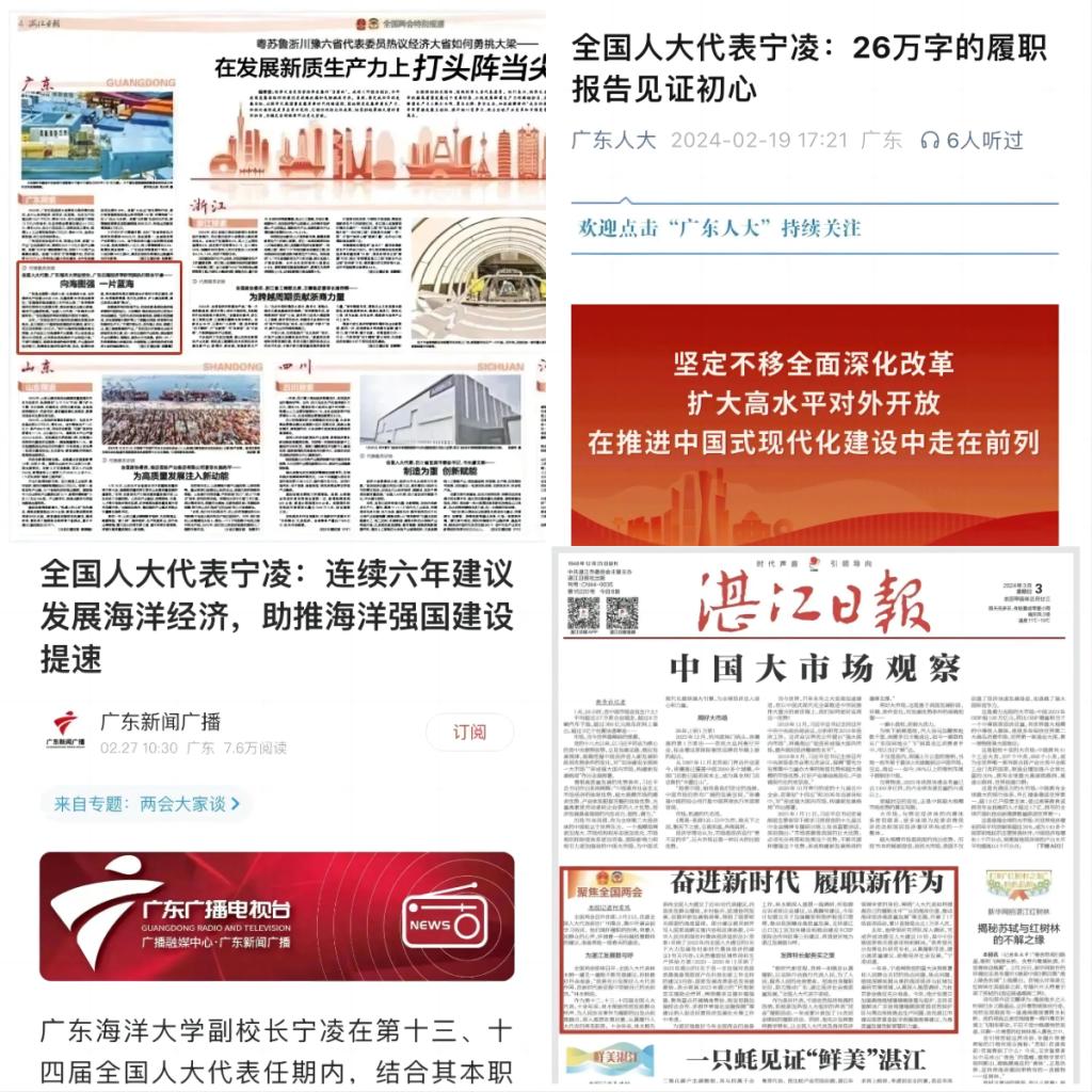 欧冠全国人大代表、副校长、广东沿海经济发展研究院执行院长宁凌,带着一年来深入基层调研所积累激发的新思路,以饱满的政治热情和昂扬的精神状态,认真履职尽责,积极建言献策,受到了光明网、南方日报、羊城晚报、广东电视台、南方都市报、海洋与渔业杂志、时代周报、湛江日报等多家主流媒体关注报道。