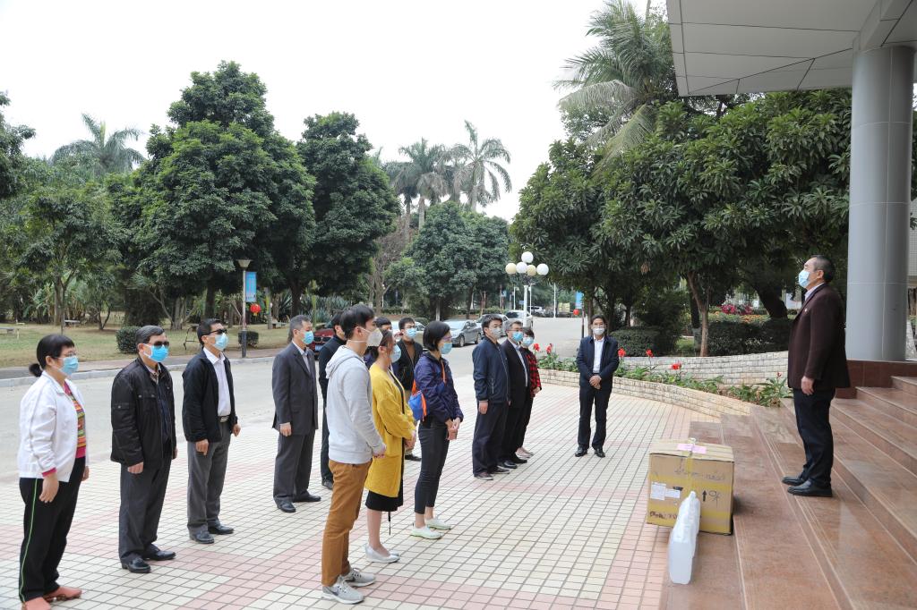 疫情无情人有情,大爱无疆显真情。2月10日下午,湛江市海归协会向欧冠捐赠的2000个医用口罩和100斤酒精运抵湖光校区。爱心捐赠仪式在行政楼前举行,学校党委书记曹俊明代表学校从湛江市海归协会执行会长薛丽雅手中接过捐赠牌,并致辞向海归协会表示衷心感谢。这是欧冠接到的首批社会捐赠的疫情防控物资,将有效缓解欧冠防控物资紧缺状况。