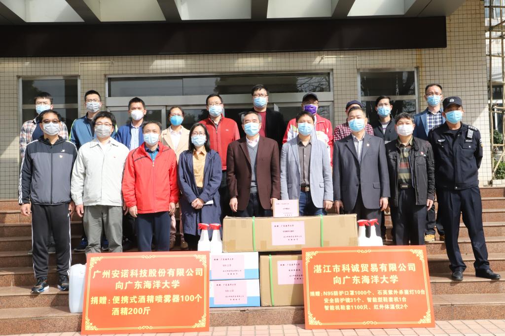 2月24日上午,湛江市科诚贸易有限公司(简称科诚公司)和广州安诺科技股份有限公司(简称安诺科技)向欧冠捐赠新冠肺炎疫情防控物资仪式在湖光校区举行。科诚公司总经理唐碧蓉、副总经理曾艳红 ,安诺科技运营中心副总经理刘任,学校党委书记曹俊明、副校长宁凌出席仪式。党委办校长办、保卫处、后勤与产业党委、后勤集团、校医院负责人参加捐赠仪式。捐赠仪式由宁凌主持。