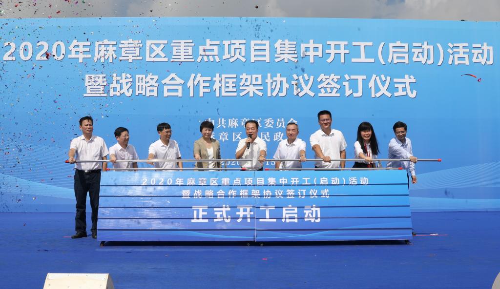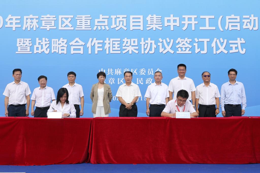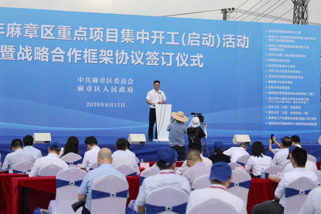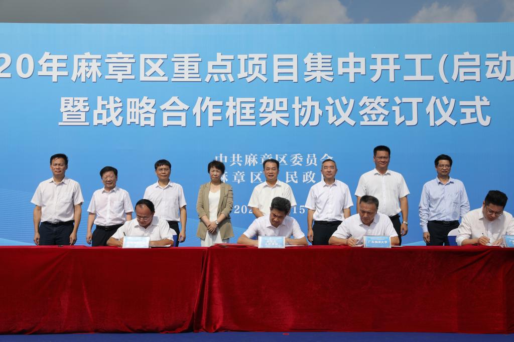 8月15日上午,2020年麻章区重点项目集中开工(启动)活动暨战略合作框架协议签订仪式在麻章开发区太和工业园举行,湛江市委常委、常务副市长曹兴,欧冠党委书记曹俊明、岭南师范学院院长兰艳泽、麻章区区长陈思远等市、区和相关职能部门领导、驻湛高校和企业代表参加了仪式。欧冠党委常委、副校长宁凌,校长办公室主任李育芳代表学校分别与麻章区政府、广东海谷科创投资股份有限公司签订了战略合作框架协议。