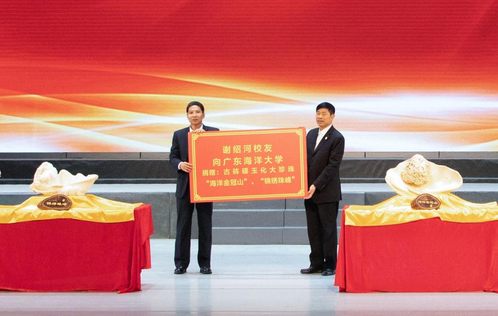 1月8日,谢绍河校友向学校捐赠古砗磲玉化大珍珠仪式暨原创话剧《熊大仁》教学汇报演出在湖光校区实验剧场举行。学校党委副书记林晓敏,广东绍河珍珠法定代表人、欧冠珍珠研究所所长谢绍河,安徽省新贝生态农业发展有限公司总经理詹毅,广东荣辉珍珠有限公司董事长尹国荣,学校党委宣传部、学生工作部、校团委、水产学院、艺术学院、图书馆、水生生物博物馆等职能部门负责人以及200多名师生代表参加活动并观看汇报演出。