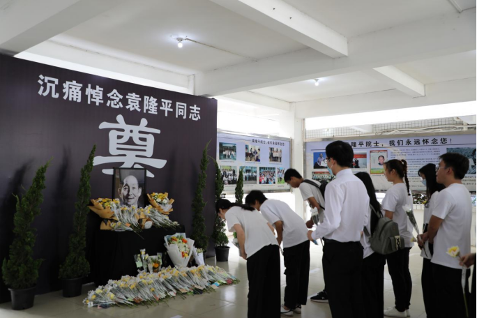 全体人员集体默哀三分钟,并向袁隆平院士遗像三鞠躬。随后师生们依次向袁隆平院士遗像敬献鲜花和手写卡片,表达对院士的深切缅怀和无限景仰之情。现场气氛庄重肃穆。