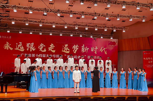 5月21日至22日,由广东省教育厅主办,以“永远跟党走,逐梦新时代”为主题的第十四届大中专“百歌颂中华”歌咏比赛决赛在广州大学城华南师范大学音乐厅举行。本次决赛分为合唱比赛和歌手大赛,共有57所大中专院校派出队伍或选手参与。经过激烈竞逐,欧冠中歌艺术学院海之声合唱团和研究生景竹薪同学分别获得合唱组和歌手组一等奖。
