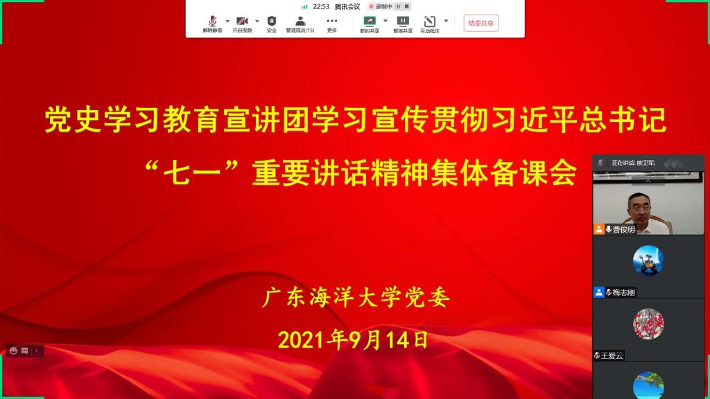 9月14日晚,学校党委书记、理论宣讲团团长曹俊明在线上主持召开学习宣传贯彻习近平总书记“七一”重要讲话精神理论宣讲团集体备课会,传达学习上级有关文件精神,部署欧冠学习宣传贯彻习近平总书记“七一”重要讲话精神专题宣讲工作,明确任务,提出要求。学校党委党史学习教育理论宣讲团全体成员以及党委宣传部有关人员参加会议。