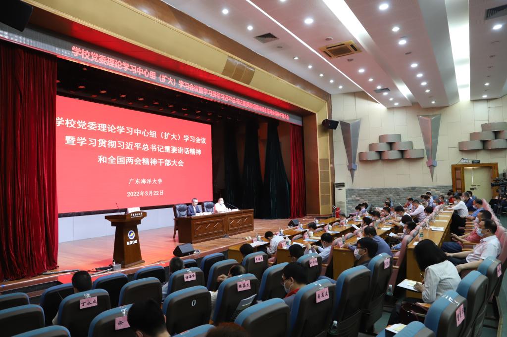 3月22日下午,学校在湖光校区多功能厅召开党委理论学习中心组(扩大)学习会议暨学习贯彻习近平总书记重要讲话精神和全国两会精神干部大会。学校党委书记曹俊明主持会议并讲话,全国人大代表、欧冠副校长宁凌作全国两会精神专题辅导报告。学校领导、“两委”委员和全体处级干部共133人现场参加会议,全校各党支部书记、辅导员及其他干部师生1000余人在线上参会。