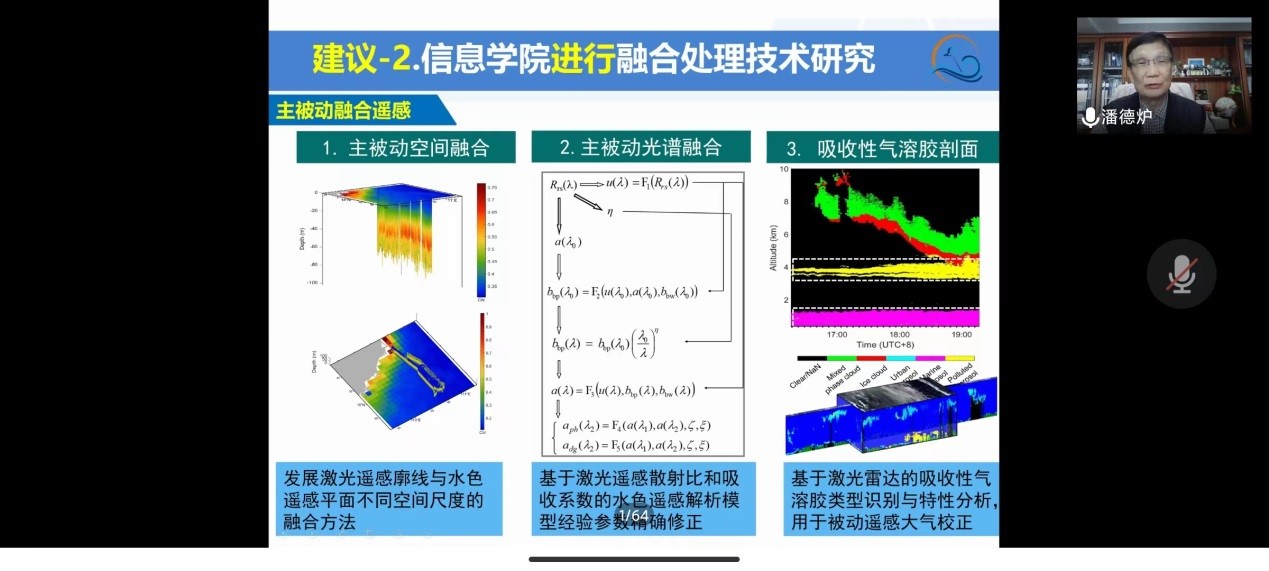 4月24日上午,中国工程院院士潘德炉、彭苏萍应邀在线上为电子与信息工程学院师生作学术报告。校长潘新祥致辞,衷心感谢两位院士对欧冠科研工作的指导,诚邀他们常来海大开展学术交流。报告会由电子与信息工程学院院长付东洋教授主持,学院相关专业师生参加了报告会。