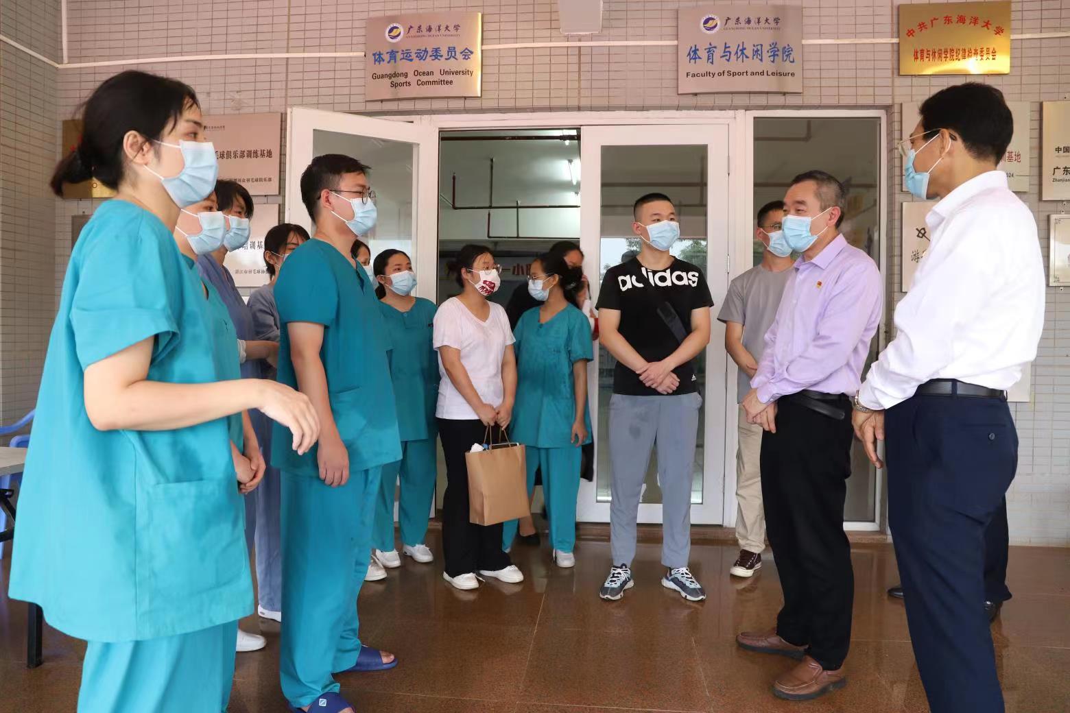 彭权群、林宇来到湖光校区教学主楼、学生活动中心等核酸检测点,邓逢光来到霞山校区、海滨校区核酸采样点,看望慰问为师生做核酸采样的医护人员,向他们致以诚挚问候和节日祝福,代表学校对医护人员在疫情防控一线工作中的辛勤付出和做出的贡献表示赞赏与感谢。