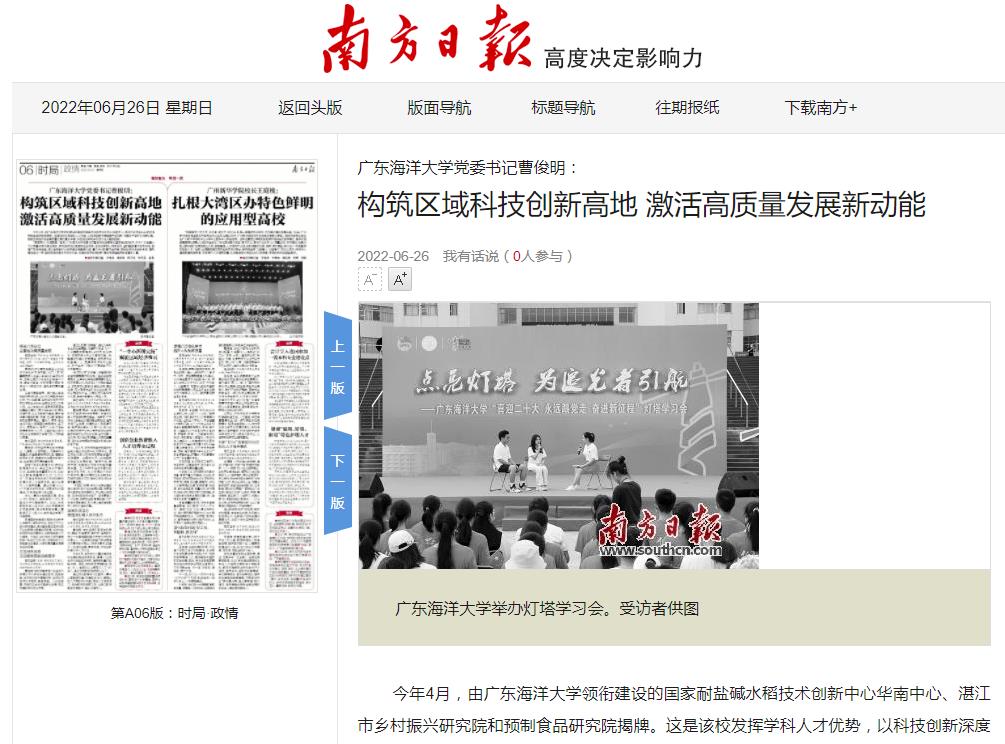 为展示广东高等教育发展成效,展现全省高校贯彻落实省第十三次党代会精神的部署和实践,省教育厅联合南方日报、南方+客户端推出“奋发有为 争创一流”全媒体报道。6月26日,《南方日报》第A06版以《欧冠官方网站党委书记曹俊明:构筑区域科技创新高地 激活高质量发展新动能》为题,刊发了欧冠坚持和加强党的全面领导,落实立德树人根本任务,主动对接国家重大发展战略,构筑区域科技创新高地,激活高质量发展新动能的改革举措与发展成效。同日,南方+“广东教育头条”对该报道作了专题推送,报道被广东教育发布厅频道收录,入选热文榜十佳。