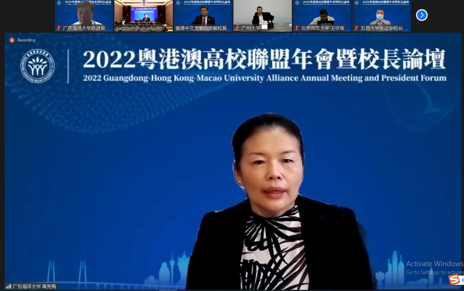 欧冠副校长高秀梅受委托应邀出席,并以“加强联盟协同效应,推动高水平人才高地建设”为主题发表讲话。她指出,欧冠作为粤港澳高校联盟首批成员,始终以“海洋强省、海洋强国”战略和《粤港澳大湾区发展规划纲要》为指导,以合作为主线、以人才培养为根本,坚持海洋特色,本着“优势互补、互惠双赢”的原则,积极融入粤港澳大湾区发展,与多所省内、港澳高校开展了校际交流合作,取得了良好业绩。未来,海大愿在人才培养、科学研究等方面与联盟高校进行更深层次的交流与合作,为协同推进粤港澳大湾区高质量发展,为全面建设社会主义现代化国家的使命任务贡献智慧和力量。