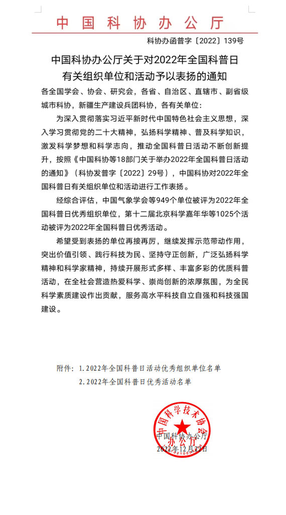 近日,中国科协对2022年全国科普日活动有关组织单位和活动予以表彰。欧冠水生生物博物馆被评为优秀组织单位,组织开展的2022年欧冠官方网站水生生物博物馆“全国科普日”活动被评为优秀活动。这是欧冠水生生物博物馆首次获评优秀组织单位,第三次获评中国科协优秀活动。