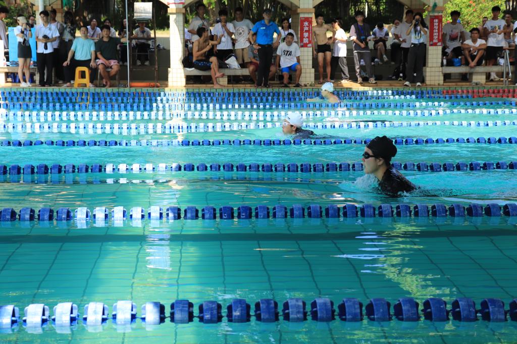 “加油加油!冲刺!双手碰壁!”闻声而去,正在进行的项目是女子蛙泳50米第一组,6号道的播音1201李灏怡在水中举起、落下,扬起漂亮的水花,用最快的速度向前冲刺。最终,以领先20米的优势获得了第一。作为学校游泳队一员的她表示,这可能是大学时期最后一次参加比赛,因此很珍惜这次的比赛机会。游泳其实是一个很享受的过程,能够磨练意志,使我们无论做什么事情都有耐心。