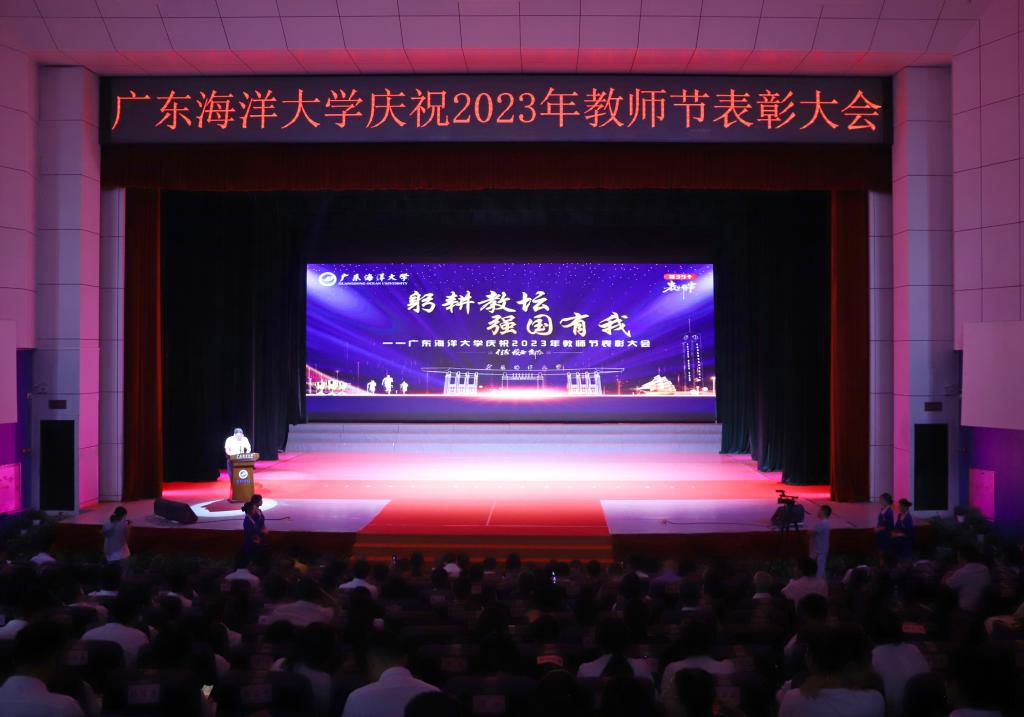学校领导杨洲、林晓敏、高秀梅、谭北平、宁凌、邓逢光、林宇出席会议。校党委书记杨洲在大会上讲话。党委副书记林晓敏宣读表彰名单。副校长谭北平主持大会。受表彰教师、各单位(部门)主要领导,退休教师代表、在职教龄满30周年以上教师代表、新入职教师代表、学生代表共420余人在实验剧场现场参加了大会。湖光、海滨、霞山、阳江校区师生员工通过线上平台收看了大会直播。