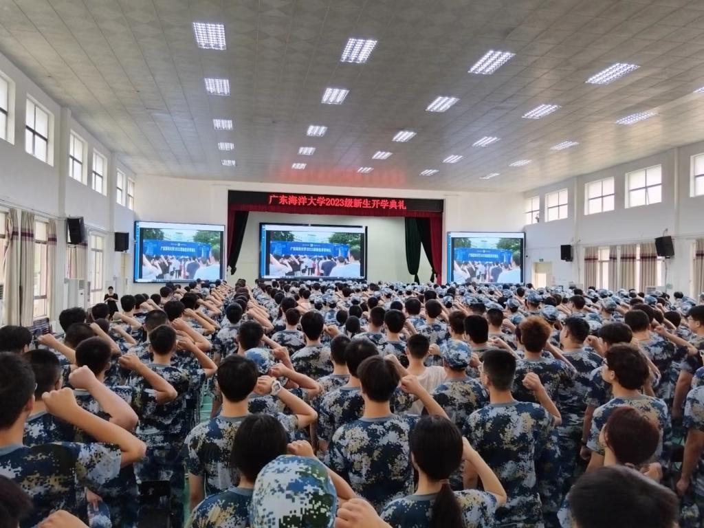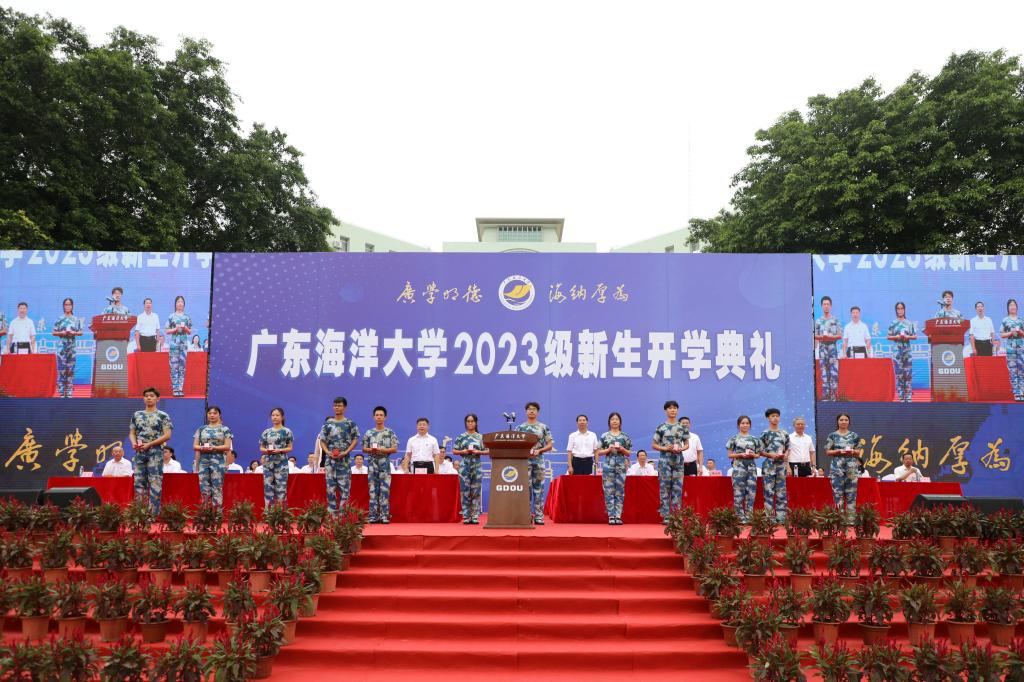 典礼中,还举行了佩戴校徽仪式。学校领导为2023级新生代表颁发校徽。2023级新同学郑重戴上校徽。一枚小小的校徽就是一生的烙印,从此2023级全体同学与海大血脉相连,万众一心、团结奋斗的精神将在新一代海大人中传承。