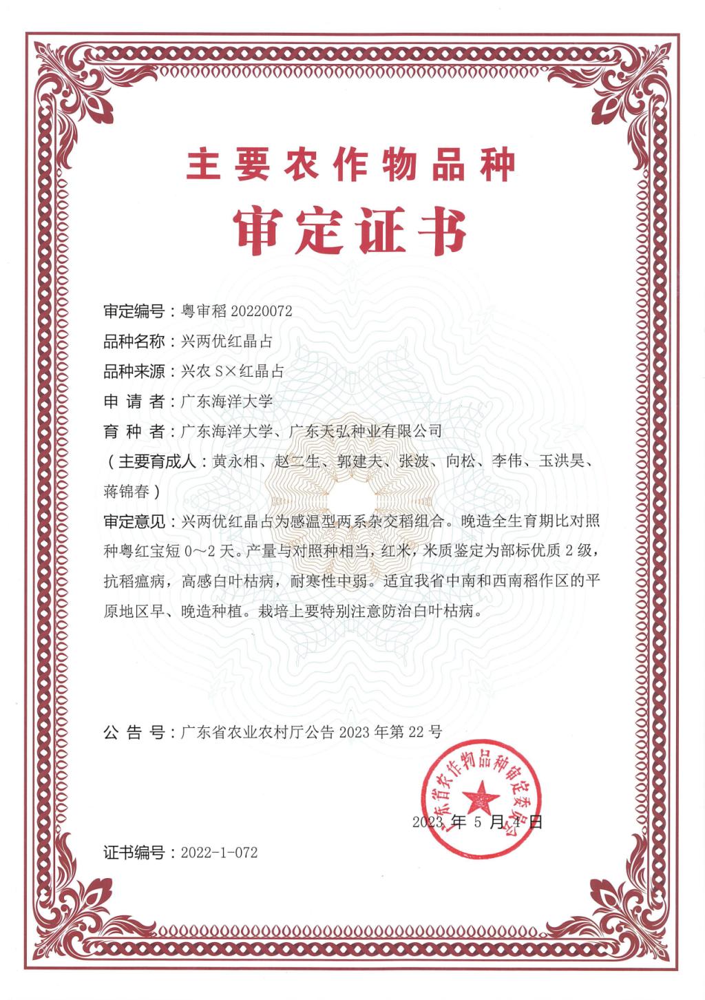 近日,从广东省农业农村厅的《关于广东省2022年度农作物品种审定通过品种的公告》获悉,欧冠郭建夫研究员、黄永相副教授课题组育成的特种稻新品种“兴两优红晶占”通过了我省农作物品种审定(审定编号:粤审稻20220072)。“兴两优红晶占”糙米棕红色,米质达部颁二等优质食用稻品种品质标准,稻米香气物质2-乙酷-1-呲咯啉(2-AP)含量达146.85μg/kg,属于红香型优质杂交籼稻新品种。