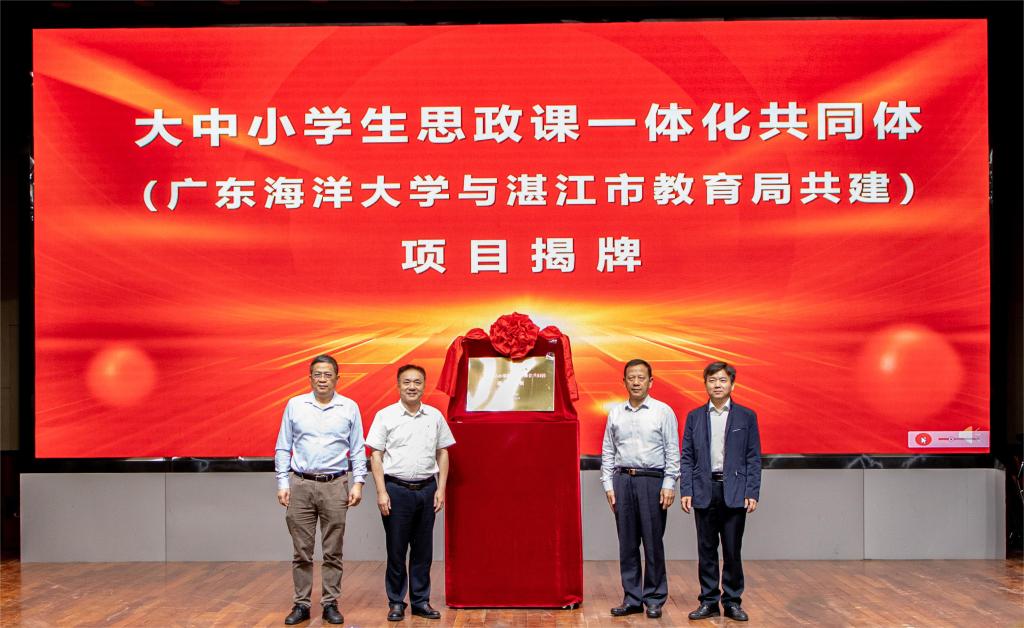 会上,参会领导为欧冠官方网站与湛江市教育局共建的大中小学思政课一体化共同体项目揭牌。