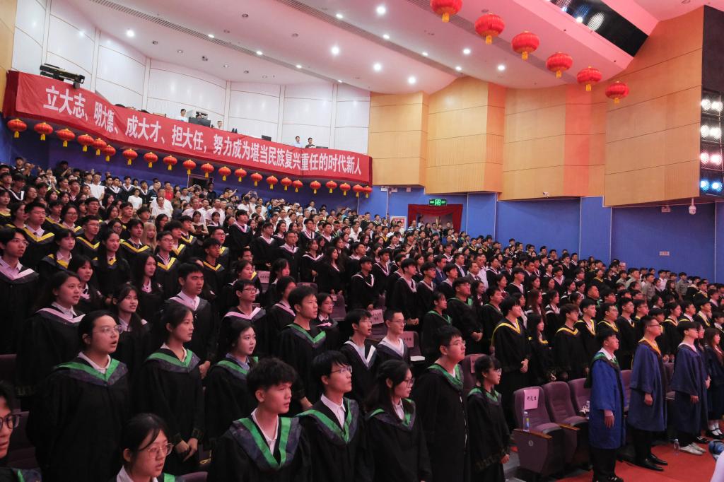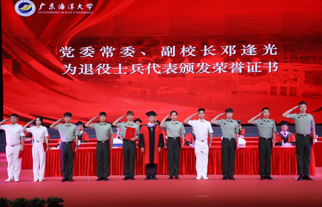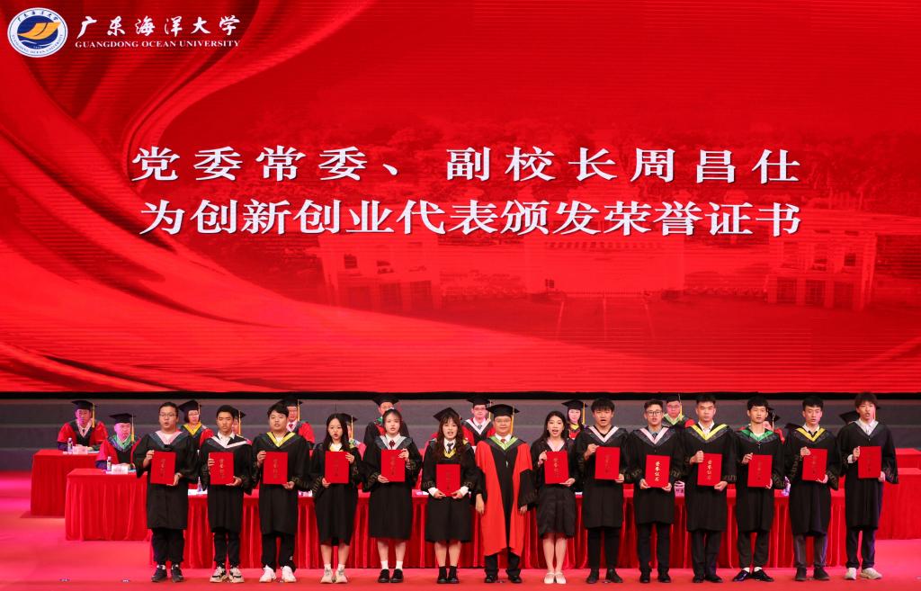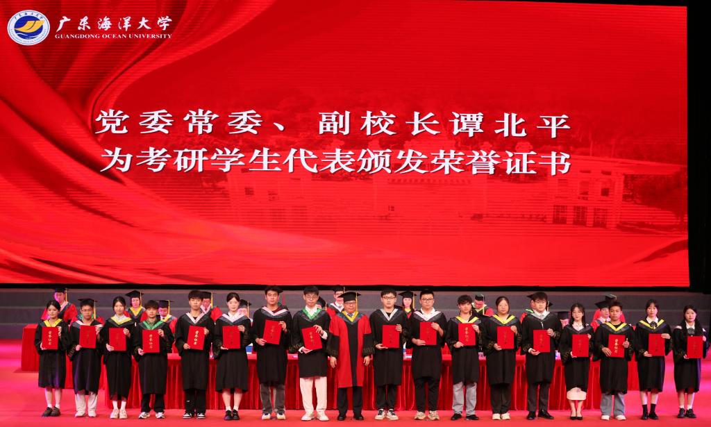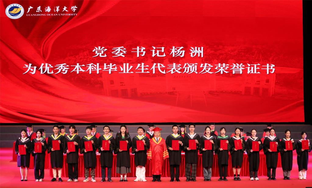 典礼上,校领导为优秀本科毕业生代表、优秀研究生毕业生代表、优秀志愿者代表、创新创业代表、退役士兵代表、考研学生代表等2024届优秀毕业生代表颁奖。“学海无涯,永攀高峰!”“向海图强,筑梦深蓝!”“梦想彼岸,我已登陆!”“青春引领创业,创新塑造未来!”“家国情怀,青春担当!”……领奖台上,毕业学子们发出“拼搏正当时”的宣言。