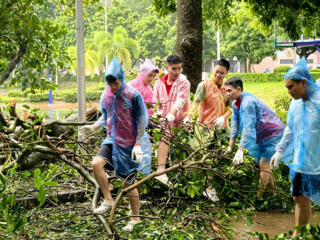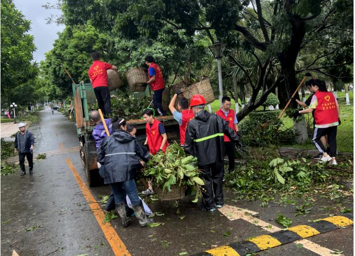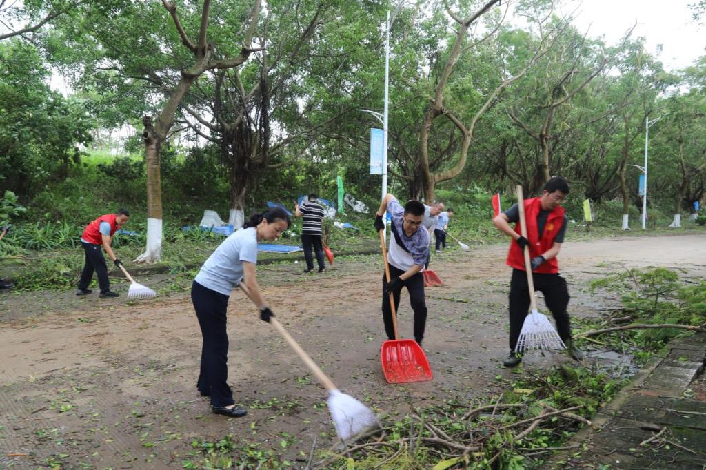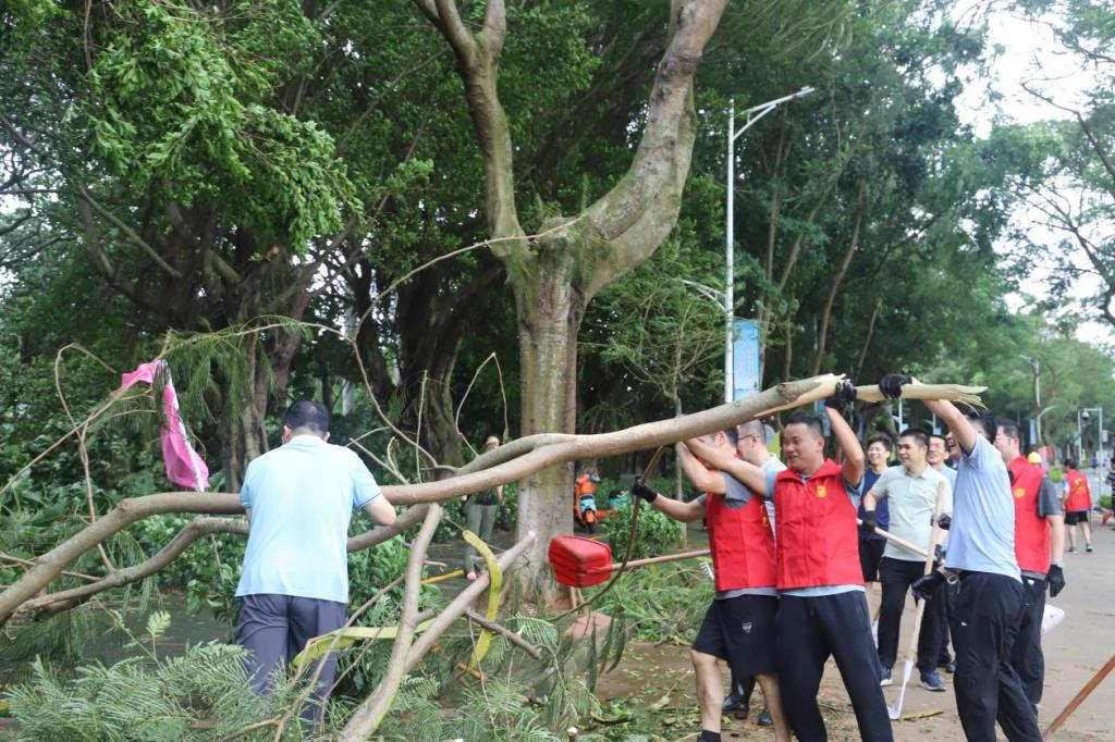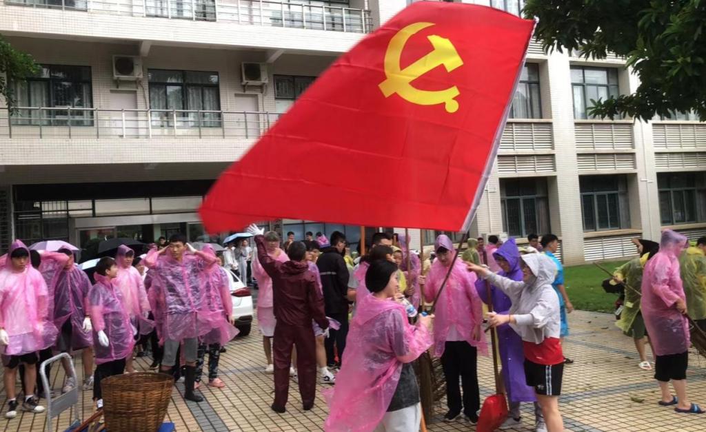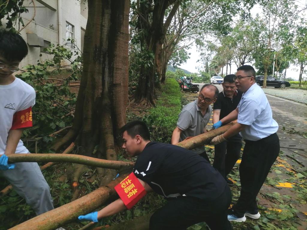 党旗高扬,闻风而动。面对超强台风“摩羯”,全校各级党组织、党员闻令而动,充分发挥党组织战斗堡垒作用和党员先锋模范作用,冲锋在前,开展防灾知识宣传、应急抢险、救援保障和灾后恢复等工作,以实际行动践行初心使命。“我报名!”“算我一个!”机关党委迅速成立防汛防风党员先锋队,各二级党组织积极动员,广大党员干部、师生热烈响应,全力投入救灾复建工作,组建行动队、服务队,凝聚守护美好校园的强大合力。他们迅速投入到校园环境清理工作,合力搬移粗壮树干、清运路面树枝杂物、拿起扫帚和铁锹等工具清理倒伏断枝和落叶,用实际行动彰显了党员担当。