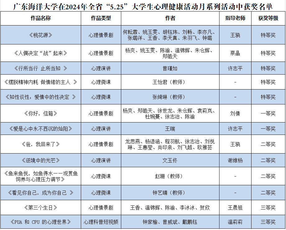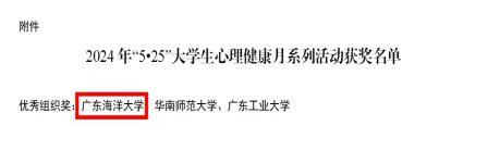 近日,广东省教育厅公布了2024年“5·25”大学生心理健康教育系列活动评选结果,欧冠师生作品在活动评选中取得优异成绩,荣获13个省级比赛奖项,其中特等奖5项,一等奖2项,二等奖4项,三等奖2项,学校荣获“优秀组织奖”,全省共有3所高校获此殊荣。