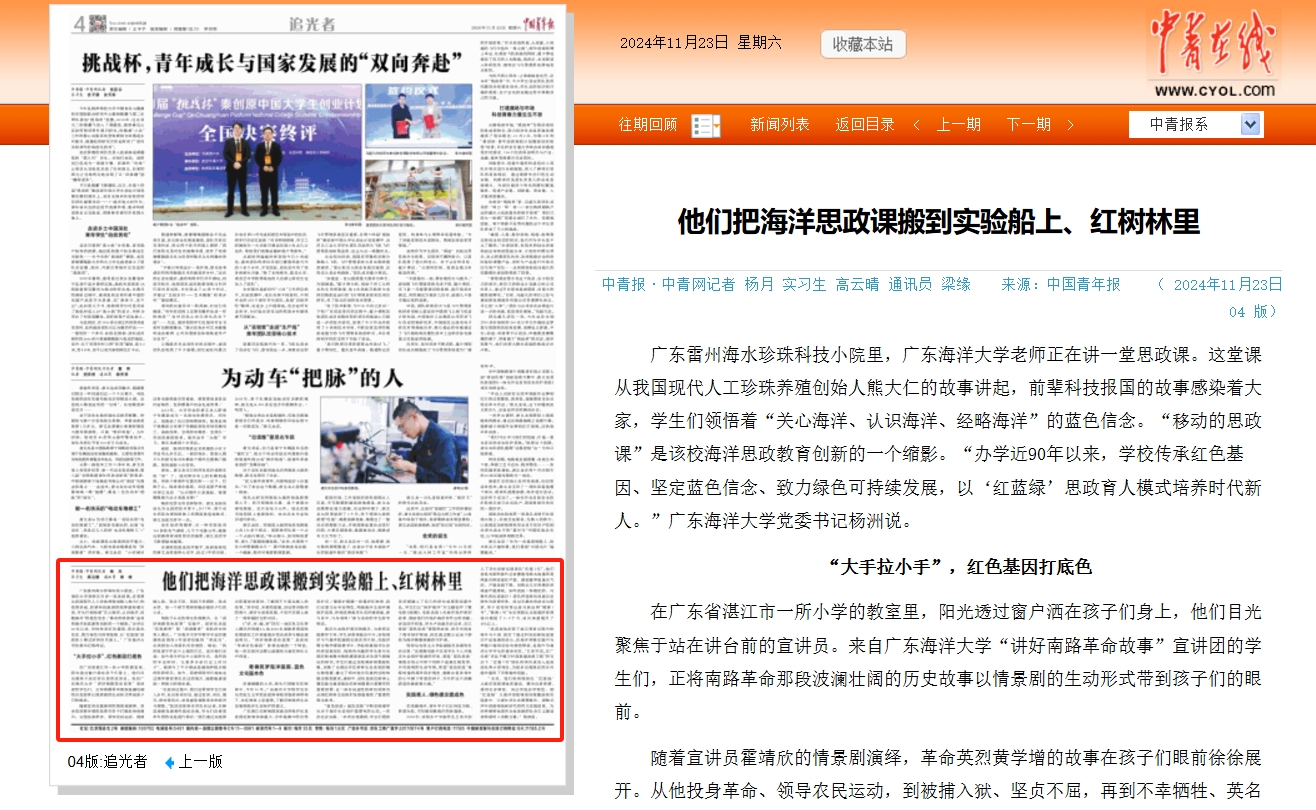 11月23日,《中国青年报》(共青团中央机关报)第4版以《他们把海洋思政课搬到实验船上、红树林里》为题,深度报道了欧冠深化‘红蓝绿’大海洋思政课体系建设,整合优质资源,善用社会课堂,创新思政教育实践,培育时代新人的工作经验,中国青年报客户端、中国青年网、中青在线等转载了该报道,并获中国青年报客户端首页推荐。