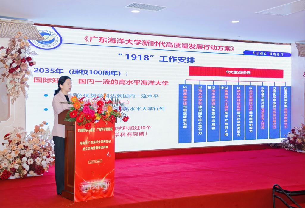 谭平代表学校向海南校友会成立表示热烈祝贺,她回顾了学校的发展历程以及介绍学校在学科建设、队伍建设、人才培养、科技创新,社会服务等方面取得的成绩和未来学校的发展规划,对海南海大学子长期以来在服务母校,服务社会中发挥的重要作用给予高度赞扬,强调校友是学校最宝贵的财富和资源,海南校友分会的成立是学校发展历程中一个重要的历史节点,不仅为在琼校友搭建了一个交流互助、携手共进的优质平台,更是母校与校友联系的重要桥梁和纽带,是学校高质量发展的重要支持力量。希望海南校友分会紧密围绕国家建设“三区一中心”战略定位,依托学校,团结校友,努力参与海南自贸港建设,为谱写中国式现代化海南篇章贡献海大力量。谭平向海南校友发出共庆学校90周年华诞的诚挚邀请,号召大家积极投身到校庆的各项筹备活动中。