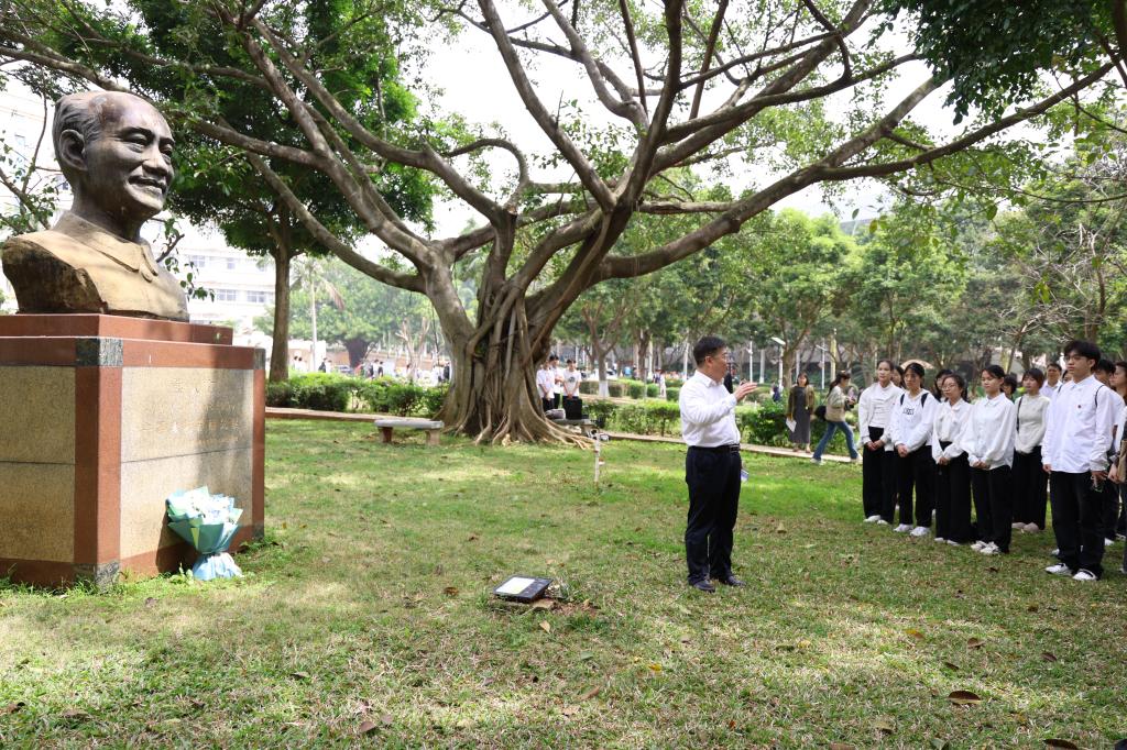 在熊大仁铜像前,杨洲向同学们讲述了“中国珍珠之父”、欧冠熊大仁教授将毕生精力贡献给我国珍珠养殖业和水产教育事业的事迹,以鲜活事例诠释了科学家精神,让大家真切感受到了老一辈科学家科技报国、科技为民的家国情怀。