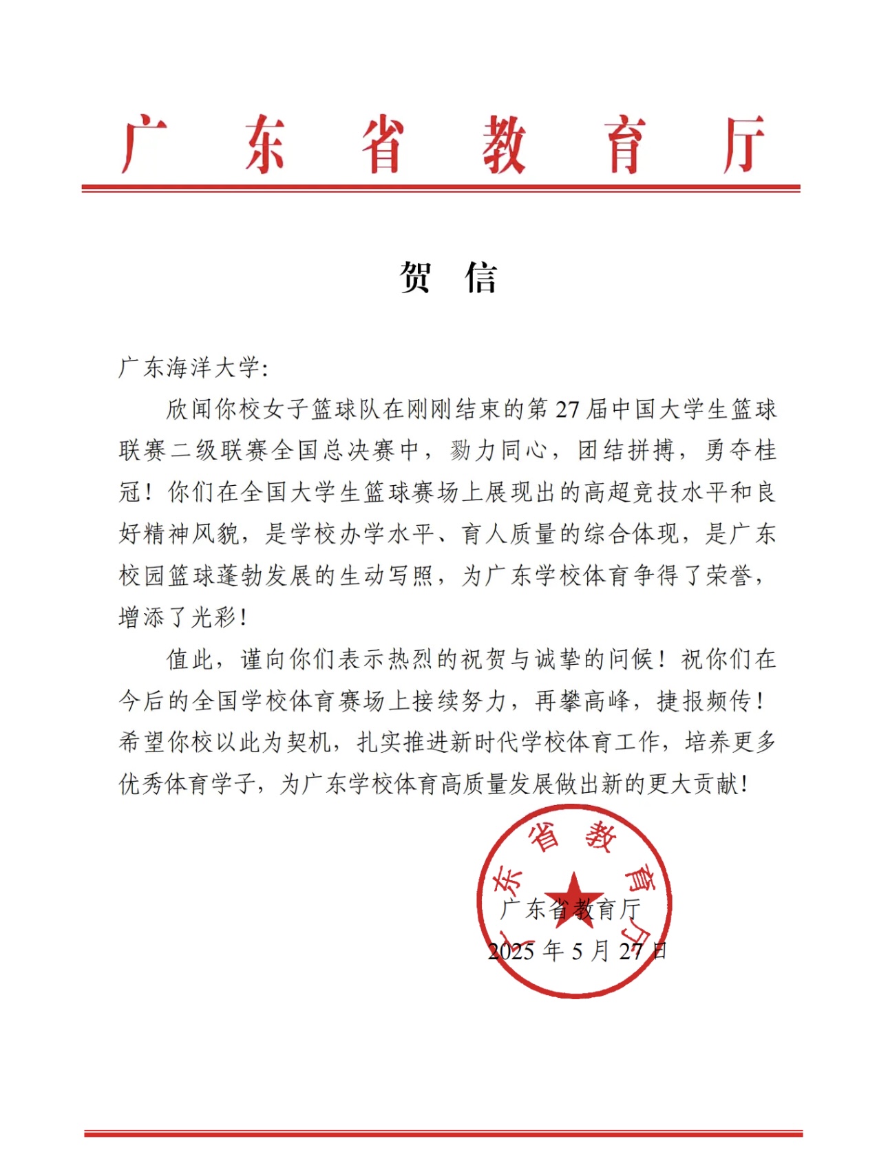 贺信中,广东省教育厅高度赞扬了海大女篮在赛场上展现出的高超竞技水平和良好精神风貌,指出这是学校办学水平、育人质量的综合体现,是广东校园篮球蓬勃发展的生动写照,为广东学校体育争得了荣誉,增添了光彩。并勉励学校以此为契机,扎实推进新时代学校体育工作,培养更多优秀体育学子,为广东学校体育高质量发展做出新的更大贡献。
