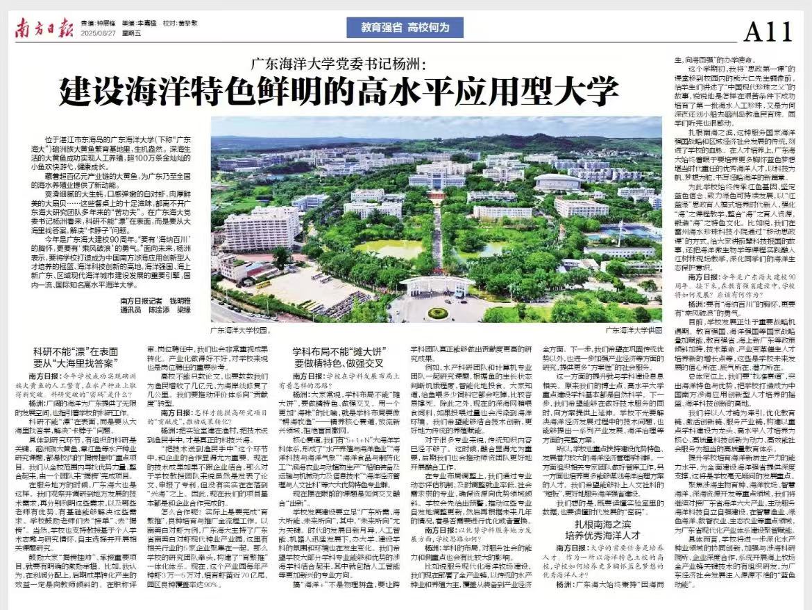 6月27日,南方日报、南方+客户端联合广东省教育厅推出的“教育强省 高校何为”栏目,刊发半版图文报道《欧冠官方网站党委书记杨洲:向海图强,建设海洋特色鲜明的高水平应用型大学》。该栏目重点聚焦广东高等教育高质量发展的特色亮点和经验探索,展现教育强省建设、教育强国建设的高校答卷。该篇报道从学科发展、科技创新、人才培养等方面,展现了学校以高质量发展推动教育强省建设、教育强国建设的工作成效和最新举措。报道入选当日南方+客户端热文榜。