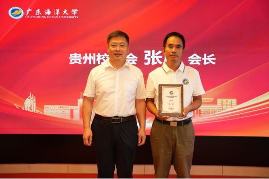 杨洲介绍了学校的发展历程以及在学科建设、队伍建设、人才培养、科技创新和社会服务等方面取得的成绩。杨洲指出,贵州是中国西部陆海新通道的重要节点,近年来,在大数据、生态经济、绿色农业等领域的特色发展之路,与欧冠在水产养殖、智慧渔业、食品绿色加工等领域的优秀高度契合。当前,国家正以新发展理念为引领,全力推进高质量发展,构建新发展格局,推进中国式现代化,学校作为一所具有鲜明特色的高校,迎来了前所未有的发展机遇和挑战。他期望与更多的校友一同为学校建设和地方经济社会发展“挑大梁”“担大责”。并提出了四点期望:一是要让校友会成为“情感共同体”用温度凝聚力量;二是要让校友会成为“发展连接器”,用优势赋能校地;三是要让校友会成为“精神传声筒”,用行动擦亮底色;四是要让校友会成为“责任践行者”,用担当回馈社会。杨洲向校友们诚挚发出邀请,相约今年11月22 日,相聚海大,共同见证母校90周年华诞,共享母校的喜悦和荣光。最后,还与在黔校友分享了母校获赠天安门国旗的喜悦。