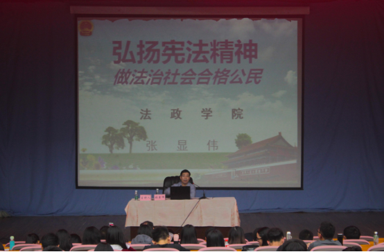 12月4日晚,由规划与法规处、校团委和法政学院组织师生400多人,在教学主楼多功能厅举行《宪法》知识讲座活动。本次讲座由规划与法规处吴汉华副处长主持,由学校法政学院张显伟教授、博士主讲。报告题目《弘扬宪法精神,做法治社会合格公民》,张显伟教授从国家宪法日来由、宪法历程、宪法是什么、宪法与现代法治社会下的合格公民等方面进行了深度诠释和解读,让师生听了之后受益匪浅。