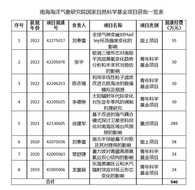 9月8日,根据国家自然科学基金委员会关于2022年度项目批准的通知,欧冠南海海洋气象研究院海洋气象研究团队获得四项国家自然科学基金项目的支持,共获直接经费145万元。这四个项目是刘春雷教授主持的面上项目“全球气候变暖对Hadley环流强度变化的影响”(项目批准号:42275017),和三项青年科学基金项目,分别是张宇老师主持的“极涡三维形态对南极平流层臭氧变化趋势分析和未来状况预估的影响”(项目批准号:42205076),陈志强老师主持的“利用非线性粒子滤波改进北极海冰的数值模拟及预测”(项目批准号:42206253),李德琳老师主持的“太阳辐射年代际变化对东亚冬季风的调制机理研究”(项目批准号:42205025)。