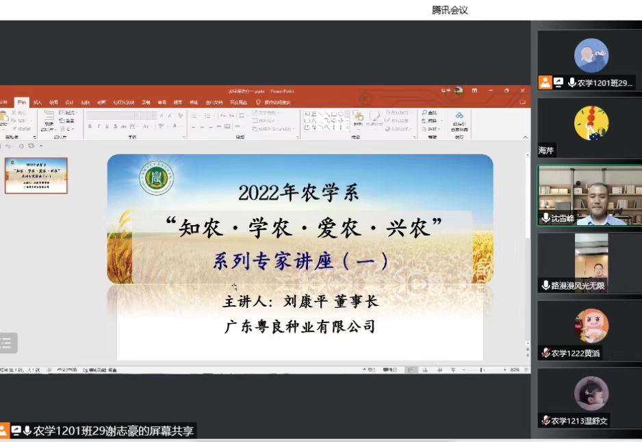 9月14日下午,应滨海农业学院农学系邀请,广东粤良种业有限公司董事长刘康平通过网络会议的形式,开展“知农·学农·爱农·兴农”专题讲座。讲座由系主任沈雪峰副教授主持,学院辅导员、班主任和农学专业两百多名学生聆听讲座。