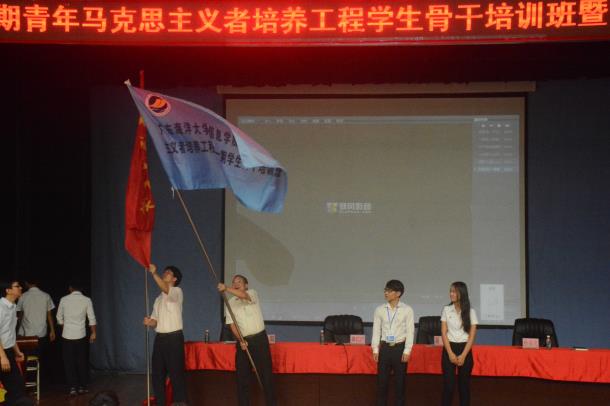 开班仪式在庄严的中华人民共和国国歌声中开始。在观看了学院第三期学干培训总结视频后,聂杰代表院党政领导对学院首期“青马工程”暨学生骨干培训班的开办表示祝贺,对为培训班筹备工作付出辛勤劳动的老师们表示感谢,并预祝青马工程培训班成功举办。接着,校青马班学员代表叶蕊蕊讲话中希望学员能踏实虚心、勤奋好学、积极主动。袁仁广代表校团委对信息学院首期青马工程骨干培训班开班表示祝贺,并对参训的学生干部们提出了几点希望和要求:一是坚定信念,紧跟党走,做中国特色社会主义道路的忠实追随者;二是善于思考,勤奋学习,用自己的实际行动感染和影响周边的同学;三是高质量完成任务,做优秀的“青年马克思主义者培养工程”的践行者,努力成为国家创新驱动发展的生力军。在开班仪式的最后,袁仁广和聂杰为信息学院首期青年马克思主义者培养工程学生骨干培训班暨第四期学干培训班授旗。