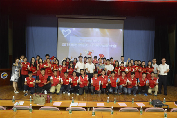 2015年,全校组织开展全校性志愿服务活动520场次, 21700人次参加,志愿服务总时数123759小时。截至2015年底,全校共有注册青年志愿者13432人。2015年,欧冠1317名同学参与了广东省第十四届运动会志愿服务、开幕式表演工作和广东省第七届省残运会志愿服务工作,志愿者出色表现得到了省教育厅罗伟其厅长等领导和导演、群众的一致好评。学校被表彰为承办广东省第十四届运动会“突出贡献单位”、志愿服务工作“突出贡献单位”和广东省第七届残疾人运动会志愿服务工作“突出贡献单位”,全校537人次受到省、市表彰表彰。社会实践团队“爱在服务队”被评为全国社会实践100强团队,青年志愿者协会扶贫开发与应急救援系列活动入选广东省2015年“益苗计划”资助项目培育成长项目,并获得1万元资金支持。