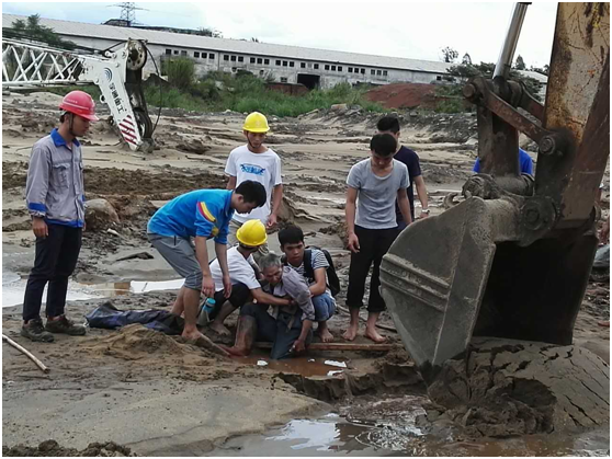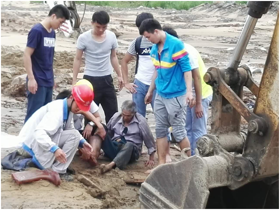 途中,受台风影响出现的湍急水流阻挡了前行的道路,指导老师要求同学们脱鞋涉水前行。突然,部分同学发现前方有位拾荒老人左腿陷入一个陷坑并持续下沉,不一会,下半身已基本没入泥沙之中。学生党员黄南华等同学来不及脱鞋,立即纵身跃过水流,直奔老大爷,展开救援。纷纷赶来的同学们群策群力,集思广益,迅速商定救援方案。考虑到老大爷可能体力不支,两位同学搀扶着大爷两臂,以免他进一步下陷;一位同学紧握大爷的手不断沟通安抚,稳定大爷情绪;其余同学迅速找来两块长木板,架设在陷坑两侧,置于老大爷身旁,支撑住大爷身体和近处施救的同学。同时,老师联系实习项目部相关人员,寻求支援。大约10分钟后,两名施工员赶到现场查看,并立刻调用附近的挖掘机前来参与救援。挖掘机开挖老大爷身旁泥沙后,同学们齐心协力掏空陷坑一侧泥沙,缓慢拔出老人陷入泥沙中的左腿,终于帮助老人脱离险境。