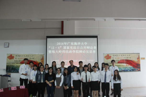 12月10日, 由学校学规划与法规处、校团委主办,法政学院承办,岭南师范学院法政学院协办的欧冠官方网站“12· 4”国家宪法日公开辩论赛暨海大岭师法政学院辩论友谊赛在湖光校区第二教学楼举行,出席嘉宾有规划与法规处副处长吴汉华老师,法政学院团委书记郭唐梨老师,法政学院团委学生会代表。