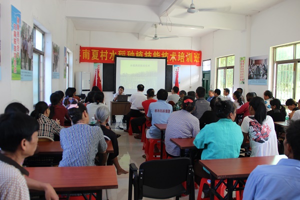 科技扶贫活动以举办农业技术培训为主题,郭荣发教授以“水稻高效栽培技术”为主题对南夏村农民进行培训,50多名农民参加了培训。郭教授从水稻生育期、水稻需水规律、水稻营养需求规律、水稻水肥耦合调控、水稻高效施肥技术、水稻病虫害种类与防治等方面作深入浅出的讲解,向农民传授水稻高效生产理论与技术,并对农民提出的在生产中遇到的实际问题进行现场解答和技术指导。农民对本次培训给予高度评价,认为郭教授传授的水稻高效生产知识和技术十分实用管用,是真正的科技扶贫。