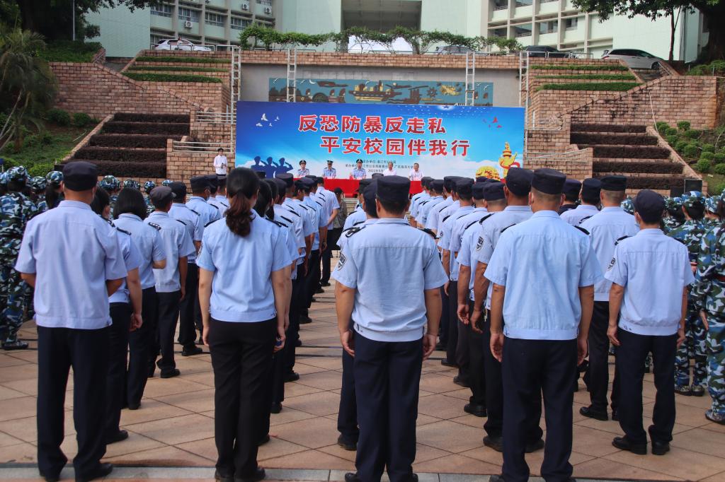 为切实提高欧冠师生反恐防暴意识和应对防范能力,9月21日下午,警校反恐宣传教育“进校园”活动在欧冠湖光校区中心广场举行,活动主题为“反恐防暴反走私,平安校园伴我行”。学校党委常委、副校长邓逢光,湛江市公安局反恐支队政委胡江,湛江市公安局麻章分局政委符南定、学校保卫处处长温一星,湛江市公安局麻章分局刑侦大队教导员陈文道出席活动,全体保卫干部、校卫队员、师生代表共计400多人参加活动。