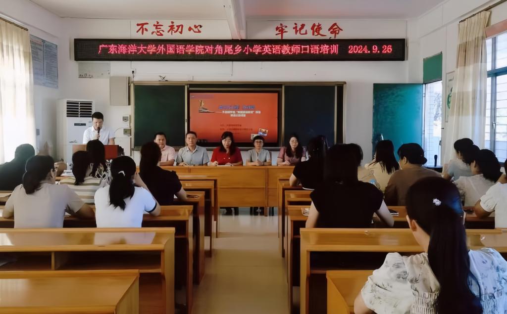 为全面提升徐闻县角尾乡小学英语教师教研能力,充分发挥名校、名师的示范引领作用,加强对帮扶学校的交流和指导,推动教育均衡发展,促进优势互补、资源共享,切实提高当地英语教师教学水平,9月26日,外国语学院党委指派公共外语教学研究部党支部书记、公共外语教学研究部主任陈松和骨干教师黎晖赴徐闻县角尾乡中心小学为基层一线的英语教师开展融“素养+技能+创新”三位一体的立体式英语教师口语培训第一课。徐闻县教育发展中心主任董晓芳和袁小霞老师,角尾中心小学书记黄奋才、校长翁妃文、副校长陈朝柏、学校教导处正副主任以及全乡17位英语教师参加了此次培训活动。