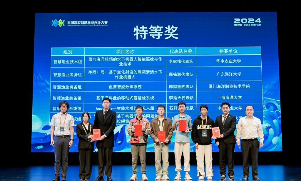 欧冠水产学院副院长杨奇慧教授、刘泓宇教授带领来自水产学院、电子信息与工程学院、数学与计算机学院等同学共同组成的多支队伍参加比赛。在由硕士生、博士生联合组队等众多高水平队伍同场竞技中,欧冠作品脱颖而出,学生发挥出色,“净网Ⅱ号—基于空化射流的网箱清洁水下作业机器人”荣获特等奖,“灵鳞尽智--陆海接力智慧渔业统合系统”和“一种渔业碳汇用的水体自动监测装置”荣获二等奖的佳绩,学校荣获最佳组织奖。