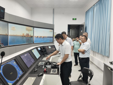 座谈会后,调研组参观了船舶与海运学院实验室。在舰船虚拟仿真实验室,欧冠展示了合作成果——茂名港博贺新港油化码头船舶操纵模拟系统,王志华模拟了操纵船舶进港;在智慧港口实验室,王志华指导了集装箱自动化码头实验室规划与使用,并表示未来将在船舶虚拟仿真、智慧港口等领域加强合作。