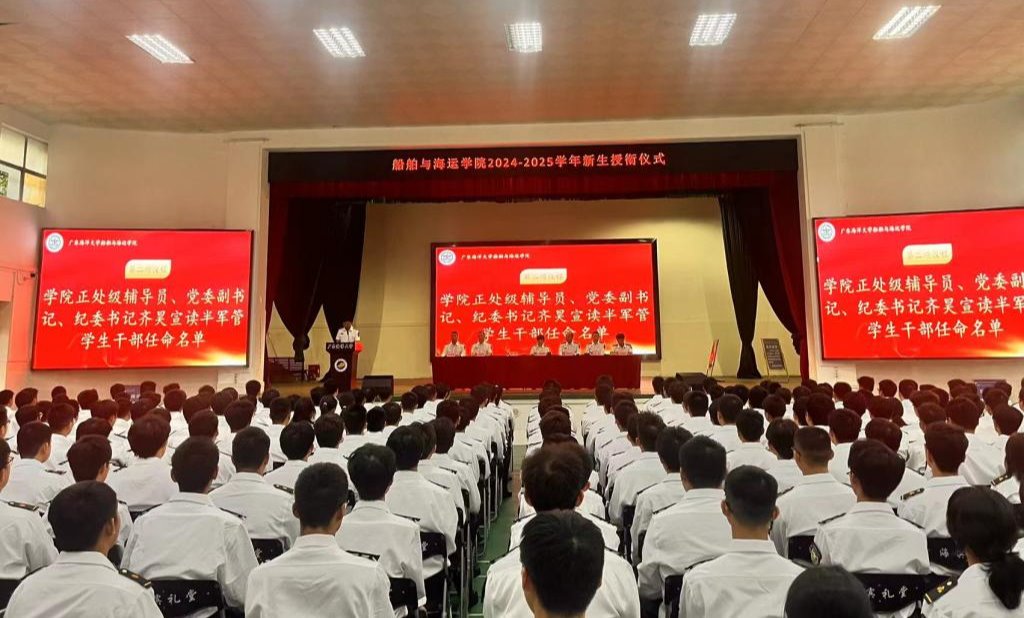 11月6日下午,船舶与海运学院在海滨校区礼堂举行2024级新生授衔仪式。学院党委书记邓朝晖,院长贾宝柱,正处级辅导员、党委副书记齐昊,半军管大队长江涛,副大队长吴捍泽及2024级各中队同学等300余人参加会议,会议由江涛主持。