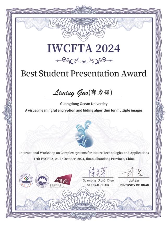 10月25日-27日,第17届复杂系统及未来技术与应用国际研讨会(IWCFTA2024)在济南大学召开。本次会议为国内外专家和学者提供了一个高水平的学术分享平台,交流和讨论复杂系统理论的最新发现及其在信息学等多个领域中的应用成果。数学与计算机学院博士生导师叶国栋教授带领硕士研究生参加了此次会议,并主持了一场分组报告。会议期间,学院2022级硕士研究生郭力铭同学作了一场题目为《A visual meaningful encryption and hiding algorithm for multiple images》的学术报告,获得了现场专家学者的好评。