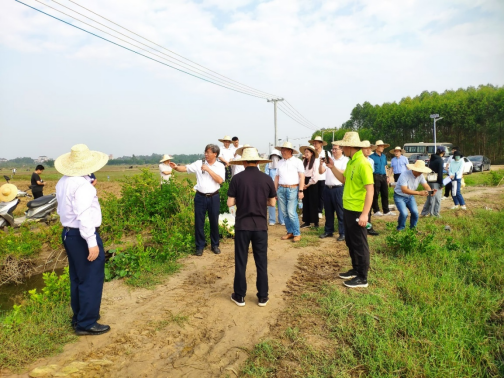 专家组在听取国家耐盐碱水稻技术创新中心华南中心副主任江行玉教授对示范种植情况的介绍后,走进田间仔细观察水稻长势,测定土质和水质数据。专家组一致认为,土质为撂荒咸酸地,水稻长势均衡,结实良好。