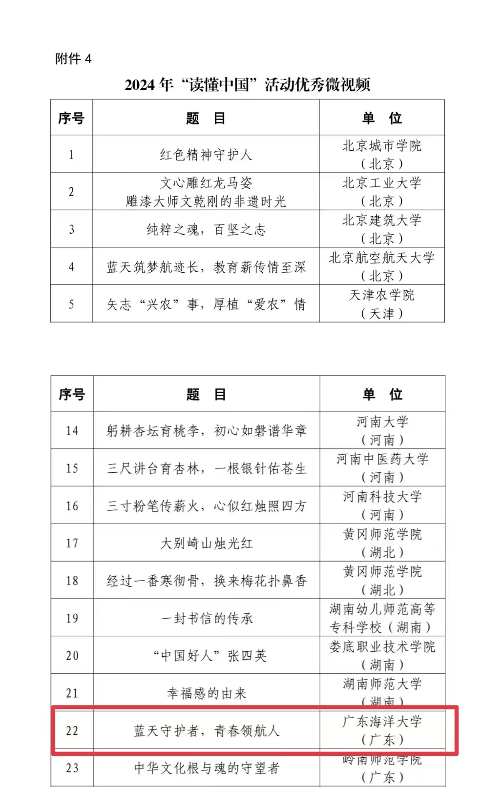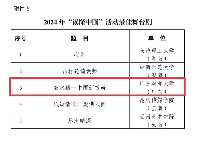 近日,教育部关工委公布了2024年“读懂中国”活动评审结果,欧冠选送的舞台剧作品《海水稻——中国新饭碗》获“最佳舞台剧”奖,《蓝天守护者,青春领航人》获评“优秀微视频”,学校获评教育部关工委2024年“读懂中国”活动表扬单位。